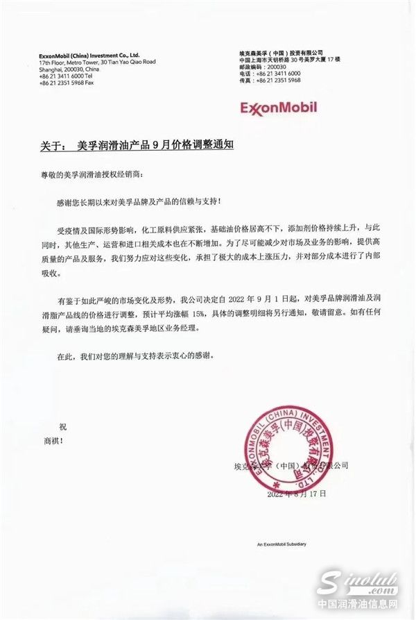 据中国润滑油信息网(sinolub.com)市场获悉,日前,埃克森美孚(中国)投资有限公司向美孚润滑油授权经销商发出“关于美孚润滑油产品9月价格调整通知”,函件表示,受疫情及国际形势影响,化工原材料供应紧张,基础油价格居高不下,添加剂价格持续上升,与此同时,其他生产、运营和进口相关成本也在不断增加,为了尽可能减少对市场和业务的影响,提供高质量的产品和服务,公司努力应对这些变化,承担了极大的成本上涨压力,并对部分成本进行了内部吸收。有鉴于如此严峻的市场变化及形式,公司决定自2022年9月1日起,对美孚品牌润滑油及润滑脂产品线的价格进行调整,预计平均涨幅15%。