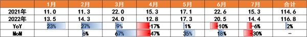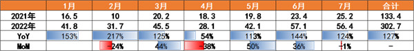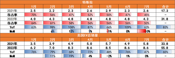 7月美国新能源车销量为8.6万辆,同比增长47%,环比基本保持不变。1-7月同比增长65%,需求旺盛。