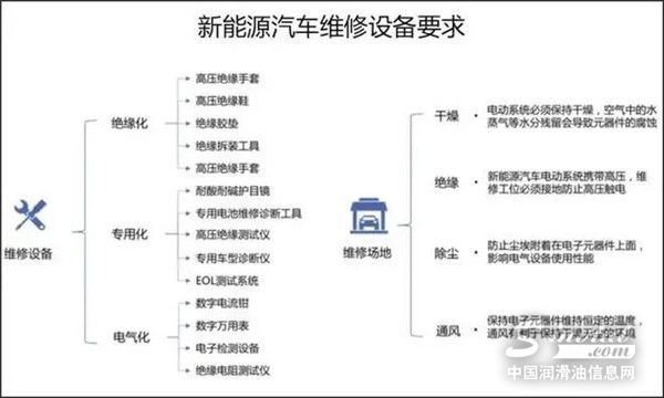 3)维保设备要求高:新能源汽车维修设备要求较高,且必须配合规范的维修场地。其中,维修设备具有绝缘化、专用化和电气化三大特征,维修场地需要满足干燥、绝缘、除尘、通风等条件。
