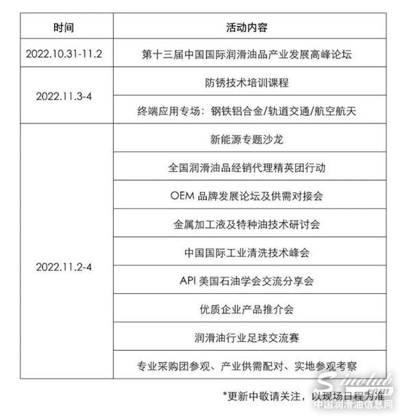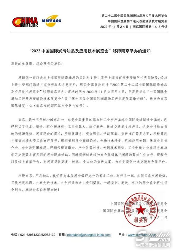 2022年11月2-4日, Inter Lubric China“第二十二届中国国际润滑油品及应用技术展览会”、MWF & SC“中国国际金属加工液及表面清洗技术展览会”及“第十三届中国国际润滑油品产业发展高峰论坛”将移师南京国际博览中心隆重召开。
