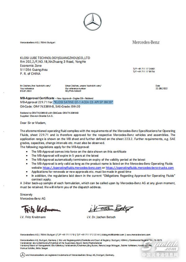 喜讯!克劳斯润滑油荣获奔驰最新MB-Approval 229.71标准认证!