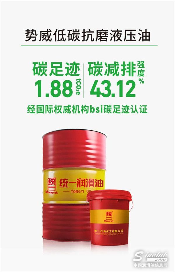 在保持优异性能的同时,不增加任何额外成本,统一势威抗磨液压油还具有低碳环保的独特属性。经国际权威机构SGS认证,该产品每吨碳足迹为1.88吨二氧化碳当量,相比行业值3.30吨,碳减排强度达到43.12%。