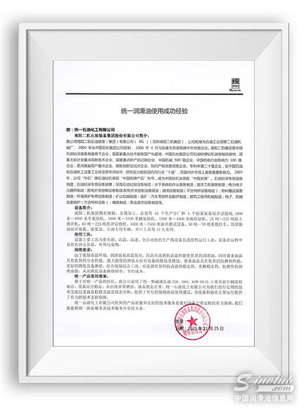 结合客户特殊的需求,统一润滑油向其推荐使用势威液压油32#、68#、85W-90 GL-5重负荷车辆齿轮油。“统一润滑油优异的产品质量和良好的技术服务是我们设备正常运转的有力保障。”南阳二机集团在使用了推荐油品后,对统一的产品和服务给予了高度的评价。