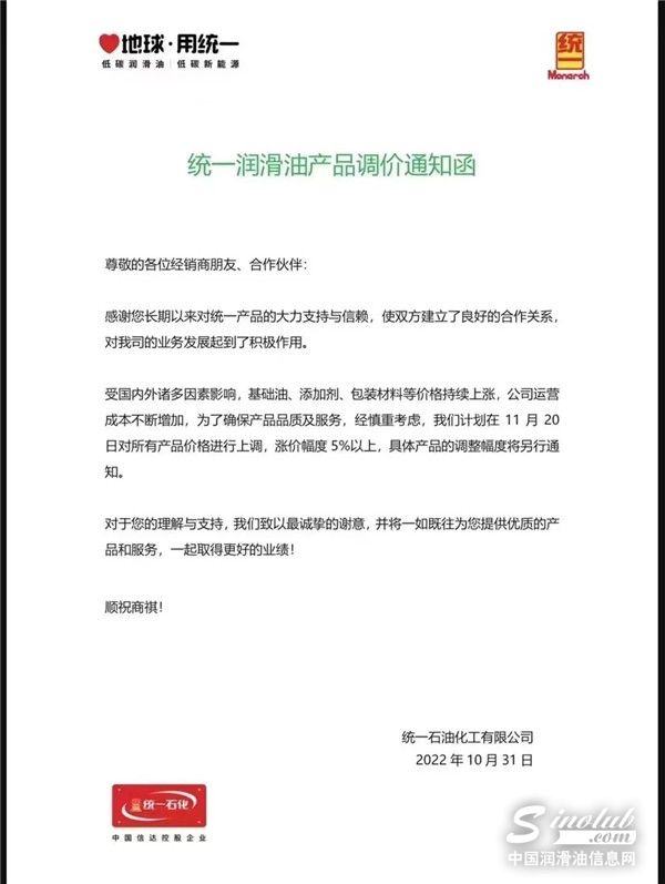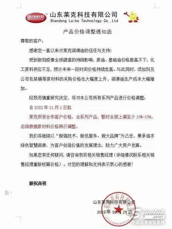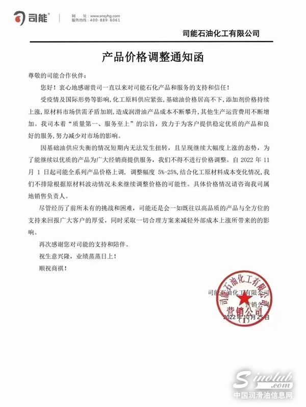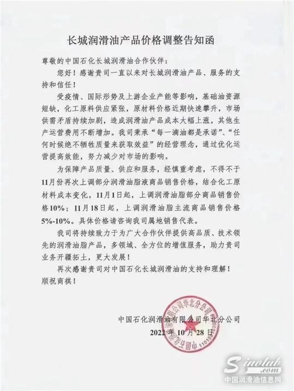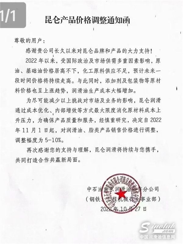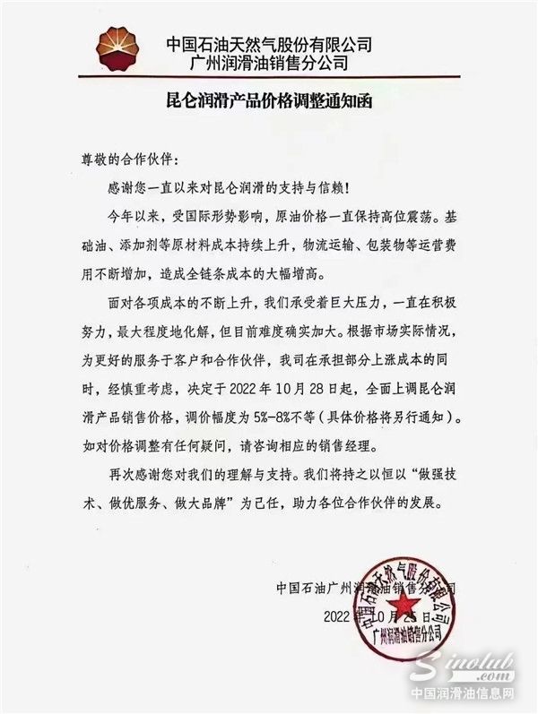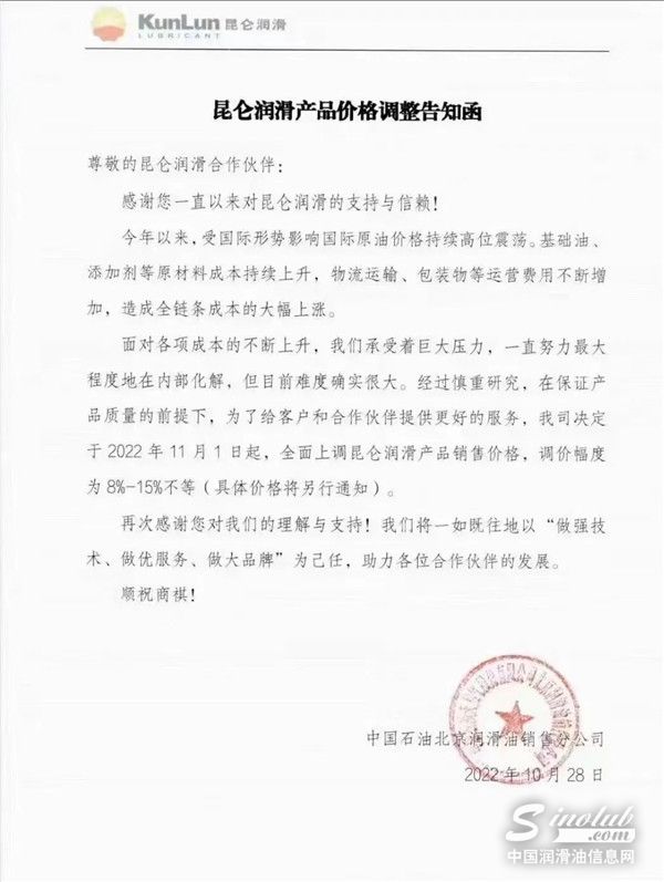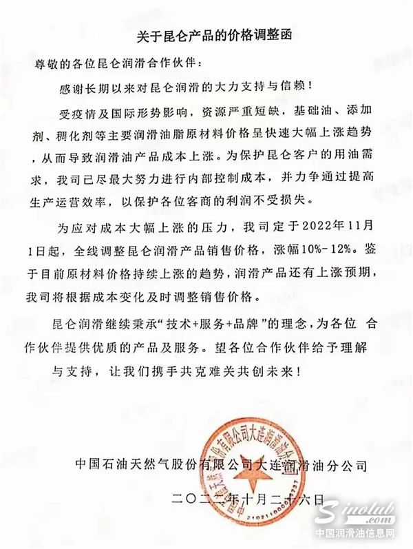 中国润滑油信息网(www.sinolub.com)从市场获悉,日前,中国石油昆仑润滑、中国石化长城润滑油等巨头再次发出涨价函,函件表示,受疫情、国际形势及上游企业产能等影响,基础油资源短缺,化工原料供应紧张,原材料近期价格快速攀升,市场供需矛盾持续家居,造成润滑油产品成本大幅上涨,其他生产运营费用不断增加。函件强调,为了保障产品质量、供应和服务,决定于2022年11月1日起,不得不再次上调部分润滑油脂液商品销售价格。