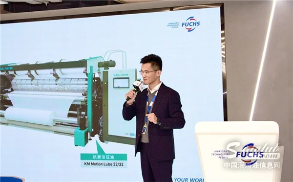 福斯中国产品高级经理林慧峰则向卡尔迈耶详细介绍了福斯在纺织行业的一站式润滑解决方案,重点推介了经福斯自主研发、专为卡尔迈耶定制并通过其测试的经编机专用油KM Motion Lube系列。该系列专用油具备优秀的空气释放性、氧化稳定性和热稳定性,能为纺织行业终端用户降低维护成本,保障设备稳定无忧运转。