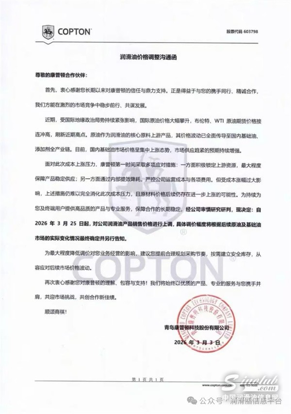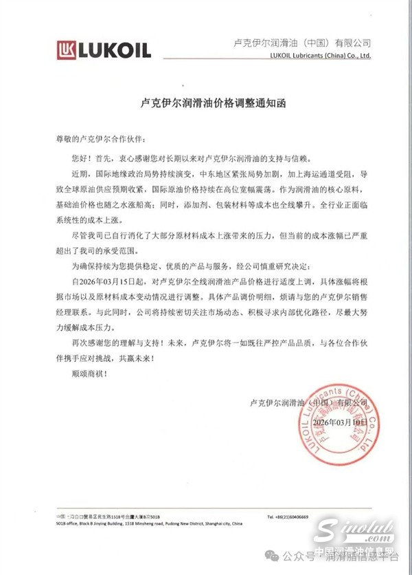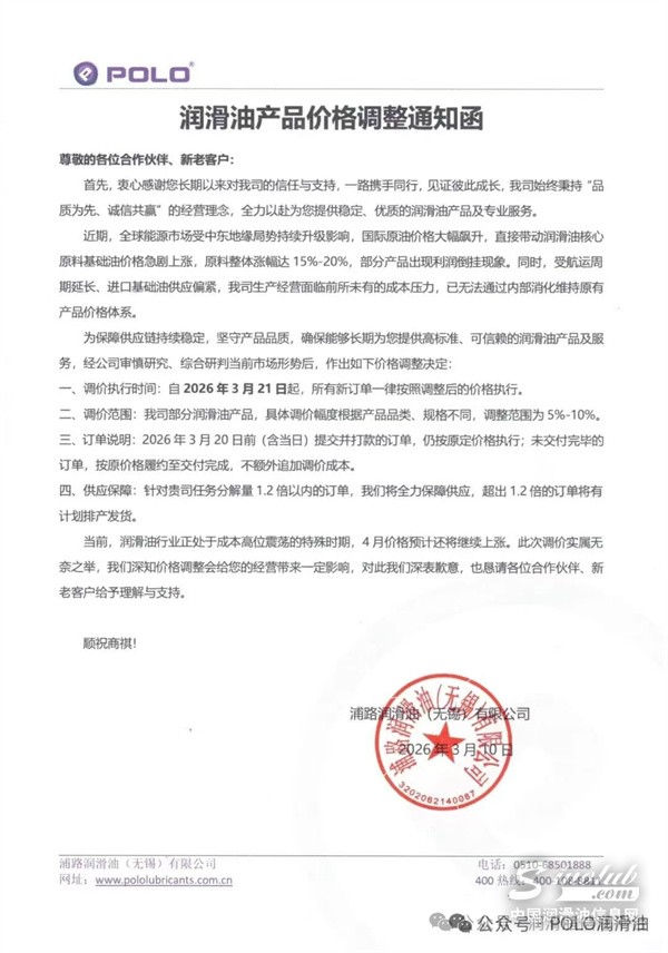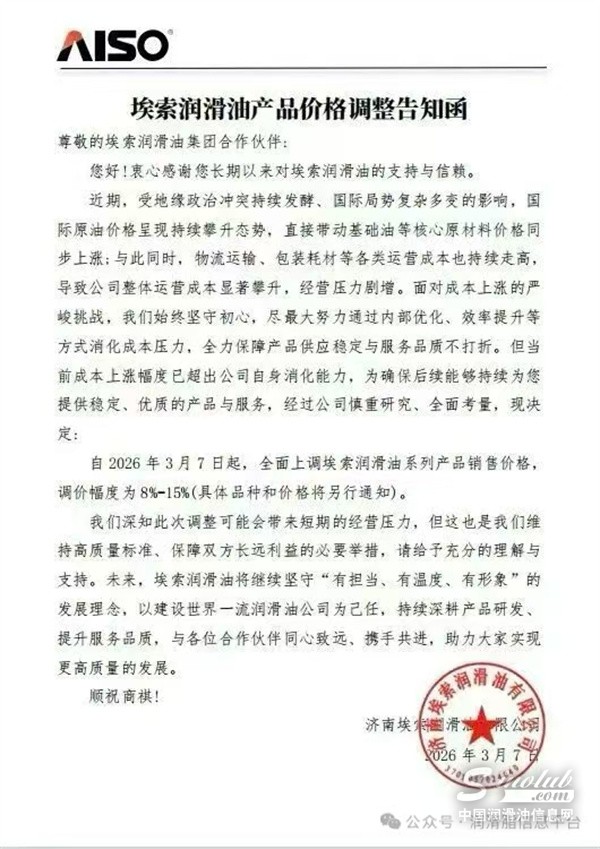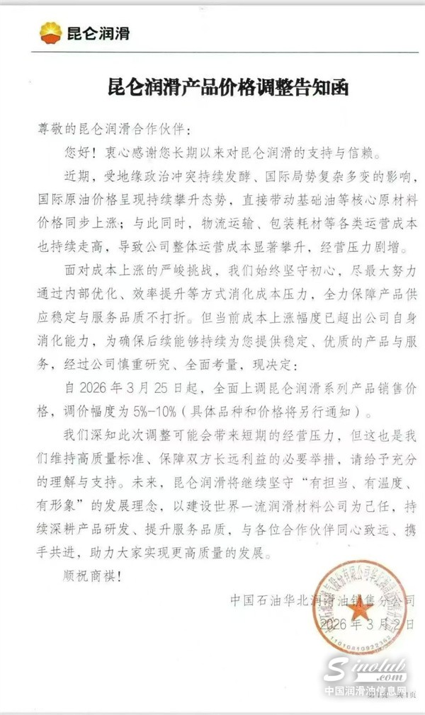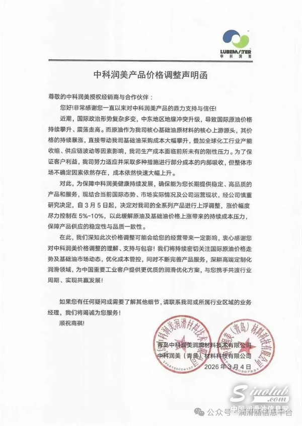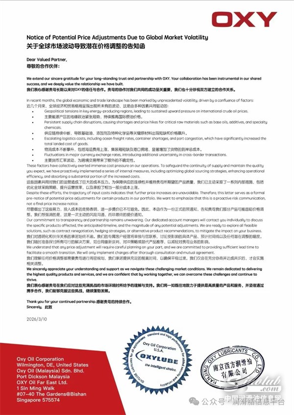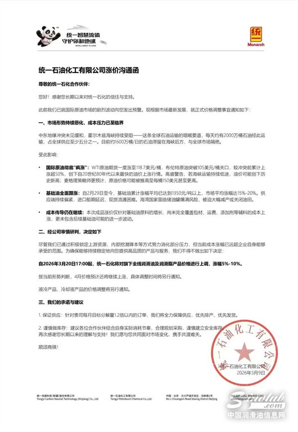 中国润滑油信息网3月5日梳理显示,国内市场上,已经有多家企业释放出较为明确的调价或风险信号:长城润滑脂自2月10日起对锂基、复合锂基润滑脂价格上调 3%-5%;昆仑润滑表示,受国际原油上涨、基础油和物流成本增加影响,将于3月中下旬上调部分产品价格,幅度约 5%-10%;统一石化也在沟通函中提到,计划于 3月20日—25日 对部分润滑油产品价格进行调整。