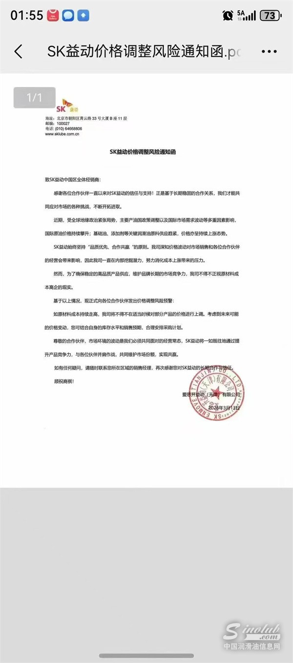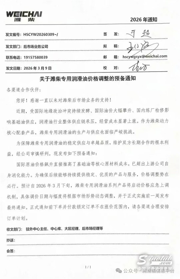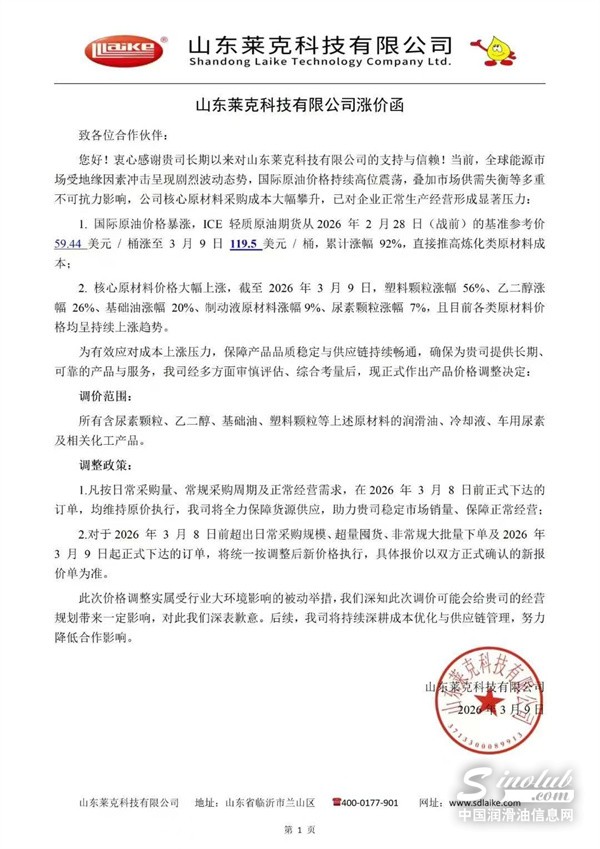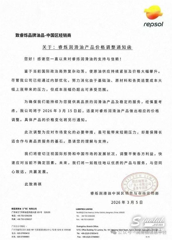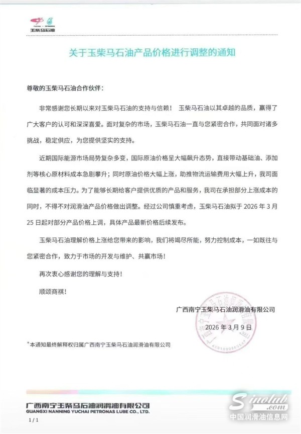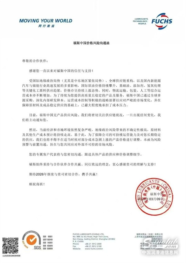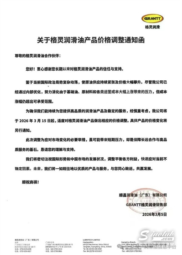 中国润滑油信息网3月5日梳理显示,国内市场上,已经有多家企业释放出较为明确的调价或风险信号:长城润滑脂自2月10日起对锂基、复合锂基润滑脂价格上调 3%-5%;昆仑润滑表示,受国际原油上涨、基础油和物流成本增加影响,将于3月中下旬上调部分产品价格,幅度约 5%-10%;统一石化也在沟通函中提到,计划于 3月20日—25日 对部分润滑油产品价格进行调整。