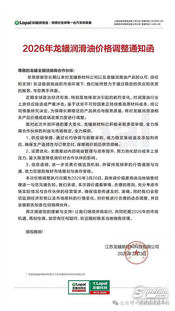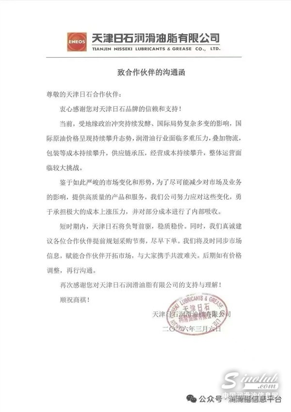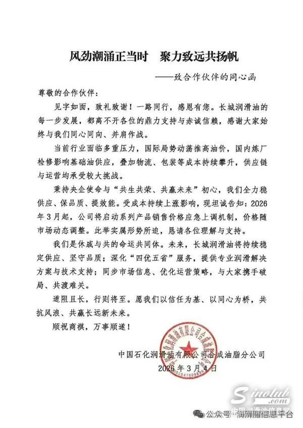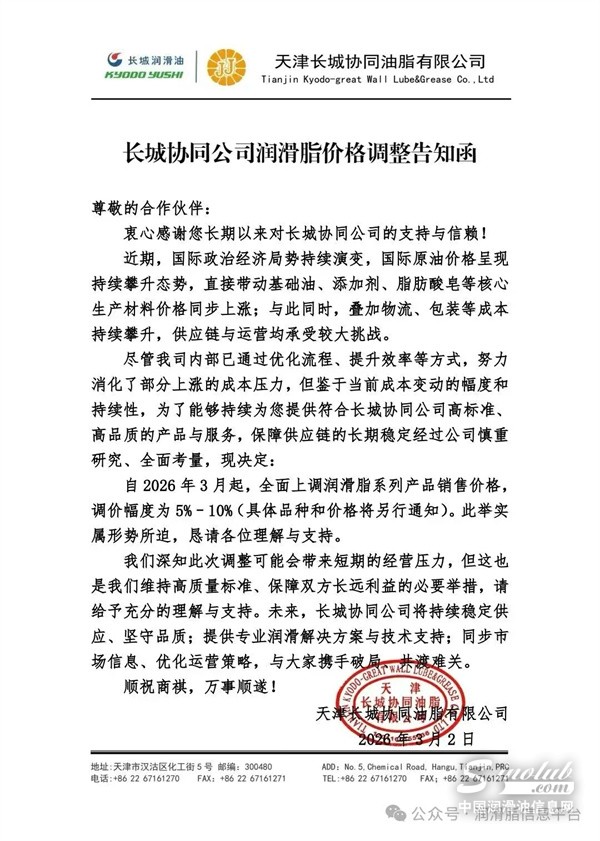 公开信息显示,长城润滑脂、昆仑润滑、统一石化等已释放出较明确的调价或调价计划信号。
