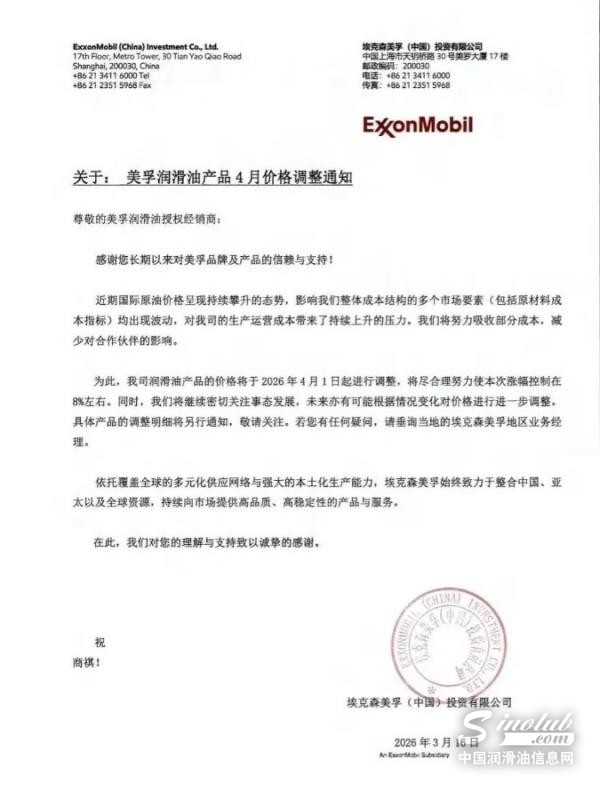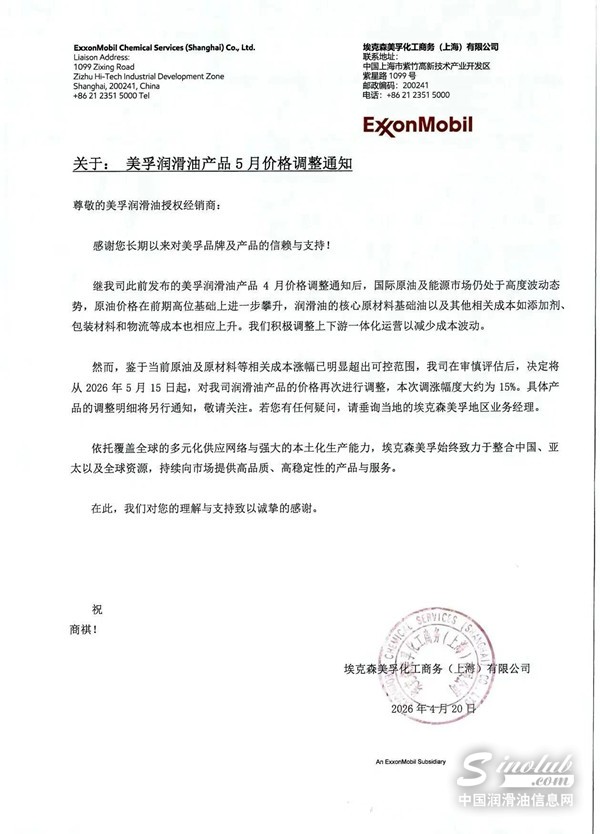 2026年4月20日,美孚率先发布了第二轮关于润滑油产品5月价格调整通知,自2026年5月15日起,对美孚润滑油产品价格再次上调,涨幅约为15%,此前于3月16日发布首轮通知,自4月1日起涨幅控制在8%左右,间隔周期仅1个半月,累计涨幅超过23%。