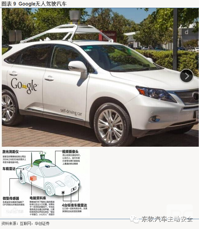 无人驾驶:无人驾驶汽车通过环境感知模块来辨别自身周围的环境信息,为其行为决策提供信息支持。汽车配备了立体多功能摄像头、车载雷达、超声波传感器。通过摄像机和雷达探测信息的叠加,可以获得周围路况信息,包括车辆精确位置,速度,障碍物形状和体积。2014年5月谷歌发布无人汽车,软件和传感装置取代了方向盘、油门、刹车灯传统汽车配置。奔驰公司的Intelligent Drive2013年9月发布,顺利完成了长达100公里的无人驾驶试验之旅,成功实现城市内及跨城之间的无人驾驶。特斯拉于2014年10月发布其P85D四驱智能驾驶版车型,增设的雷达和摄像头可以识别行人和路标,实现自动泊车、高速公路自动驾驶,堵车自动跟随等功能。2014年07月24日,百度启动“百度无人驾驶汽车”研发计划。中国汽车行业在智能汽车领域起步较晚,包括一汽、吉利等在内的自主品牌车企均表示要大力研发智能汽车,积极备战智能汽车市场争霸赛。