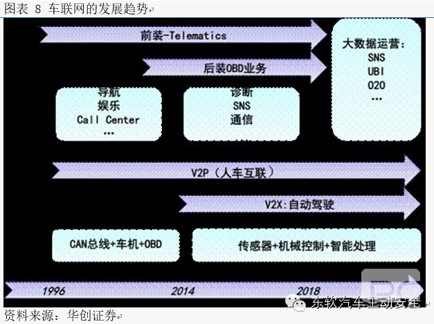 我们认为汽车有望重新演绎智能手机历史发展路线:功能车(功能机)-智能车(智能机)—车联网(移动互联网),在需求与技术的相互推动下,其业务形态也生较大的变化,催生出不同的商务模式。