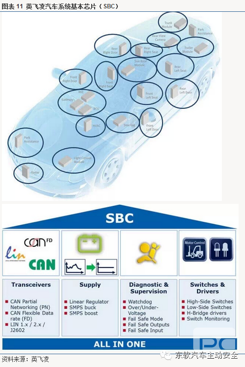 汽车电子芯片除娱乐系统外,还广泛应用在汽车 发动机和变速箱控制系统、安全气囊、驾驶辅助系统、电动助力转向、ABS、电子稳定性系统(ESP)、行人保护、胎压控制、电动车窗、灯光控制、空调系 统、座椅调节系统中。汽车电子类IC市场基本由国外厂商主导,飞思卡尔、英飞凌、NXP、意法半导体、锐萨、博世、德州仪器等占据了绝大部分市场份额。