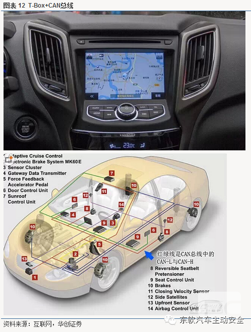 车机(T-Box)终端:是车载终端的一个形态,主要通过前装车场进行安装。通过无线通讯模块、GPS、传感器与CAN总线通讯,实现车内导航、远程监控、远程控制、安全监控及远程诊断等服务。T-box可以获得整车厂的车内总线协议,同时可获得“车规级”的系统保证 ,提供完善的供电设计保证可靠性。最早推出T-Box终端的是美国通用公司。2013年7月欧盟委员 会通过eCallI法案要求所有车内均要安装T-Box终端。宝马与奔驰也推出了自己的产品,主要的供应商包括意大利马瑞利、德国大陆、德国Perker等。车机通过CAN总线来采集数汽车厂商将总线数据大多上传至技术网络中心,通过云技术挖掘数据价值。