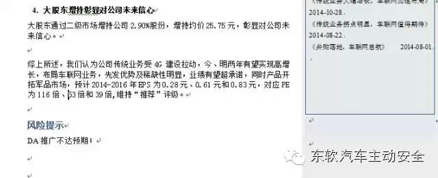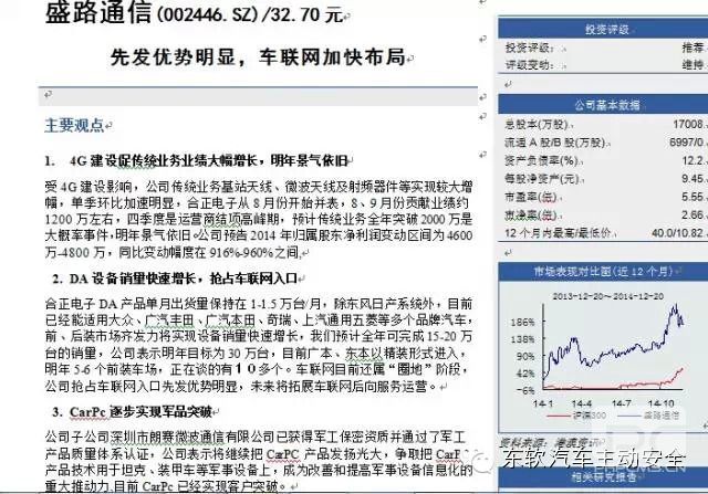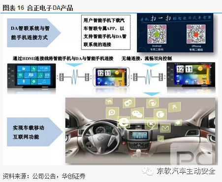 DA终端:国内在手机映射方面,上市公司盛路通信收购的合正电子在车载信息系统行业积累深厚,2013年推出DA智联系统,该产品可与智能手机无缝连接、实现车载移动互联网功能,可将智能手机上的应用全部投射到车载终端,实现流畅的双向控制,目前已通过东风日产天籁、新轩逸车型的NADS认证,同时取得苹果MFi 授权,已适配于东风日产、大众、丰田、广本等10多个畅销品牌车系的60多款中低端车型,并能同时兼容130余款主流智能手机,产品优先发优势明显。我们认为与国际互联网巨头推出的同类产品相比,DA智联系统定位中、低端车型,且价格优势明显,同时国内同类有竞争力的产品还未出现,公司可凭先发优势及早抢占市场。