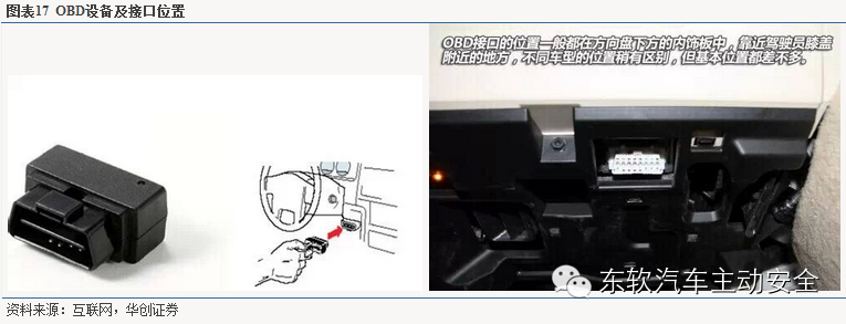 OBD(On-Board Diagnostics)接口:OBD为车载诊断系统,它最早起源于80年代的美国,1994年美国汽车工程师协会(SAE)对诊断接口、通讯方式等技术细节进行了进一步标准化工作,形成第二代OBD系统(OBD-II)。2004年之后汽车发达国家的OBD技术进入第三个阶段,中国为发现高排放车辆,于2007年7月起要求所有车辆在出厂前加装标准数据接口。目前,以无线传输故障信息为主要特征的第三代OBD系统(OBD-III)受到车联网业界广泛关注。