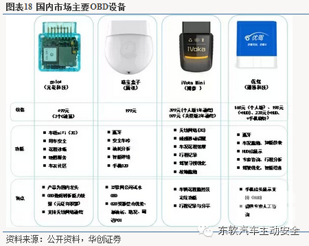 OBD设备硬件投入不大,成本在百元内,由于门槛较低,生产OBD设备国内厂家比较多,主要的产品有元征科技的golo4、博泰的iVoka Mini 、腾讯的路宝盒子及通易科技的优贺等,各厂家在产品推出的功能侧重均有差异,移动通信能力的提供成为主要趋势,但是痛点需求还比较少。