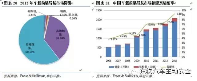 导航是车内主要的应用,国内导航前装地图厂商以四维与高德为主,根据Frost & Sullivan的数据,从2006年到2013年,中国车载前装导航市场销量及装配率持续增长,从2006年3.81%的装配率一度增长至2013年的9.28%,达到历史最高水平。2013年中国乘用车销量1906.89万辆,导航车型销量177.04万辆。其中高德从2012年占据近半壁江山的47.1%跌至2013年的36.38%,下降了10.72个百分点,四维图新从2012年的50.03%一跃增长至2013年的60.18%,上升了10.15个百分点。
