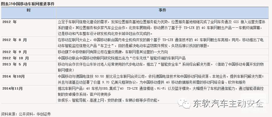前装方面,在广州车展上,上海通用宣布了“车联网”战略,并且被命名为“车·联·无限,从明年开始,会在凯迪拉克车型上基于 4G LTE 技术的安吉星系统,我们判断应该是与中国移动合作。我们认为中国移动在车联网方面的先发布局有示范效应,车联网将成为运营商流量经营的主要战场之一。