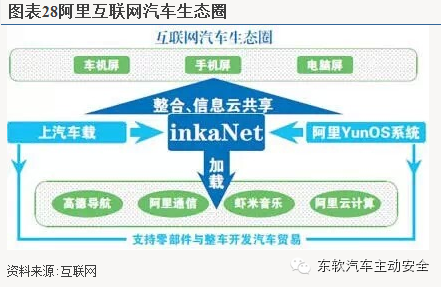 “互联网汽车”:2014年7月23日,上汽集团与阿里巴巴集团发布双方就互联网汽车达成战略合作,从支撑层、感知层、传输层、平台层、应用层全方位布局。在支撑层和感知层方面,与上汽集团的合作开发可以提供优于OBD接口的CAN总线级别的物理支撑,向上层应用提供全车数据;在传输层方面,阿里已经获得了虚拟运营商牌照,入主车联网通信运营;在平台层方面,YunOS以唯一的移动操作系统的身份入围中央国家机关政府采购协议供货商名单;上汽与阿里巴巴达成合作协议,将打造基于“云、管、端”的车联网生态圈。计划2年后推出互联网汽车,上汽负责整车与零部件开发,汽车服务贸易和实体经营,而阿里提供“CarYun OS”操作系统等软件技术支持,充分发挥电商平台优势,整合大数据、云计算、阿里通信等资源,集成天气、地图、FM、音乐、股票等功能.。